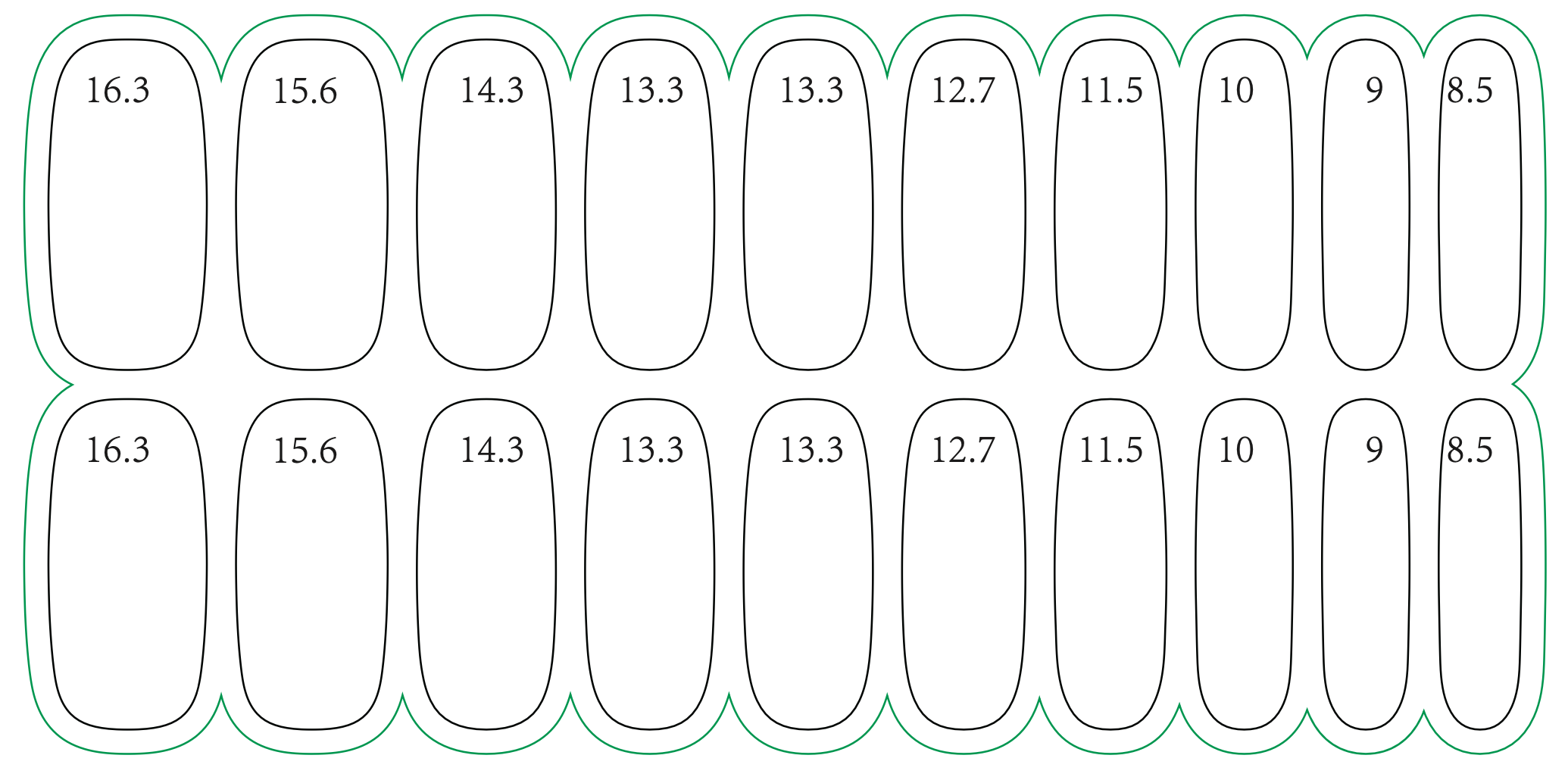 I nostri UV Gel Strips sono forniti su una scheda trasparente con 20 strisce singole in 9 misure diverse. Ogni UV Gel Strip è lungo almeno 32 mm – tagliandolo a metà puoi anche usarlo due volte. Le larghezze variano da 8,5 mm (la misura più piccola) a 16,3 mm (la più grande).